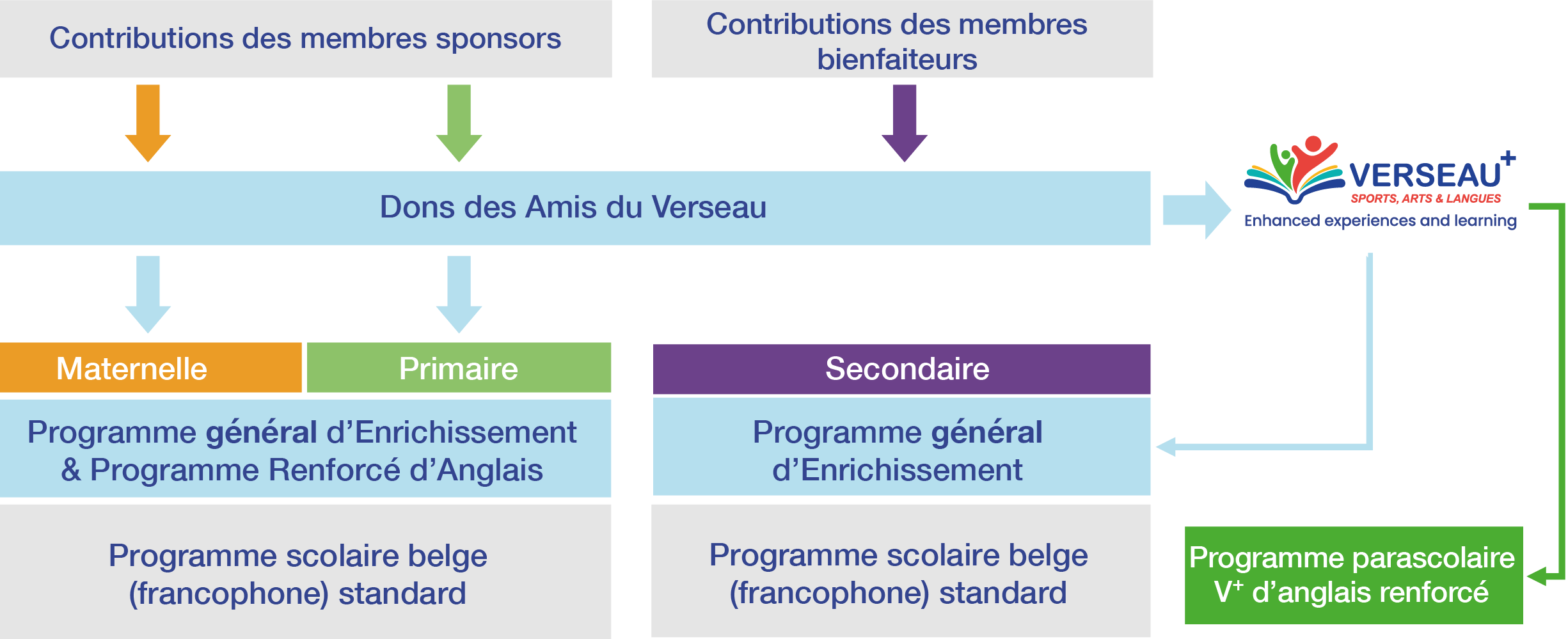 L’École Internationale Le Verseau est subventionnée par la Communauté française de Belgique, elle est gratuite pour tous et l’inscription ne dépend ni de l’adhésion aux Amis du Verseau, ni de la participation aux programmes de Verseau Sports, Arts & Langues.